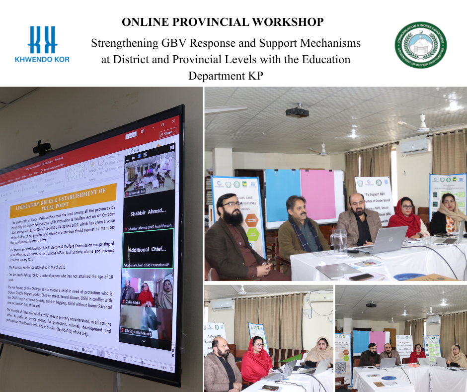 Khwendo Kor (KK), under the KP-RAP, successfully organized an Online Provincial Workshop on Strengthening GBV Response and Support Mechanisms at District and Provincial Levels in collaboration with the Education Department, Government of Khyber Pakhtunkhwa.